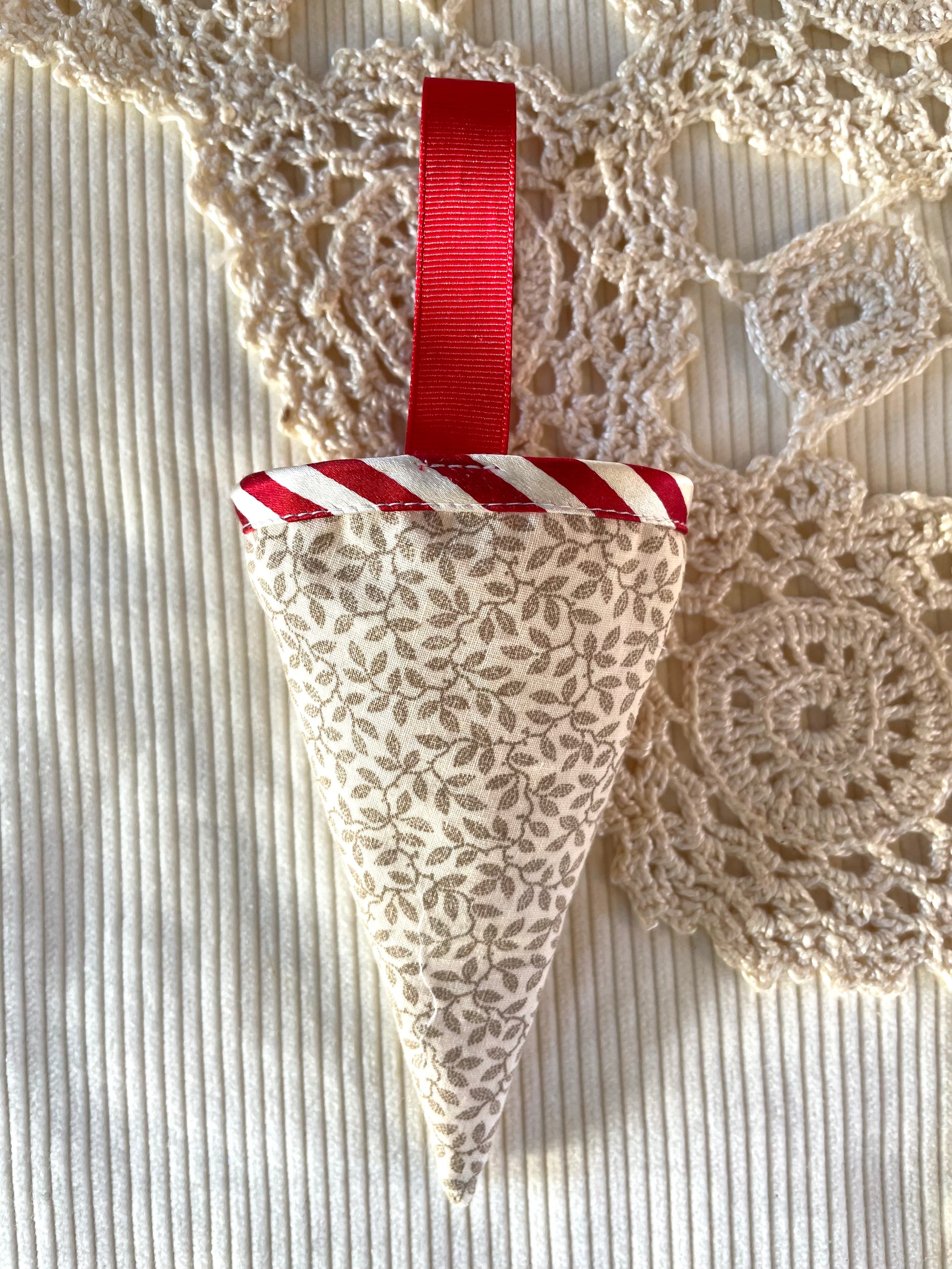 Håndlavet kræmmerhus, syet af upcyclede tekstiler - dette kræmmerhus er af bomuld med kantebånd af silke.