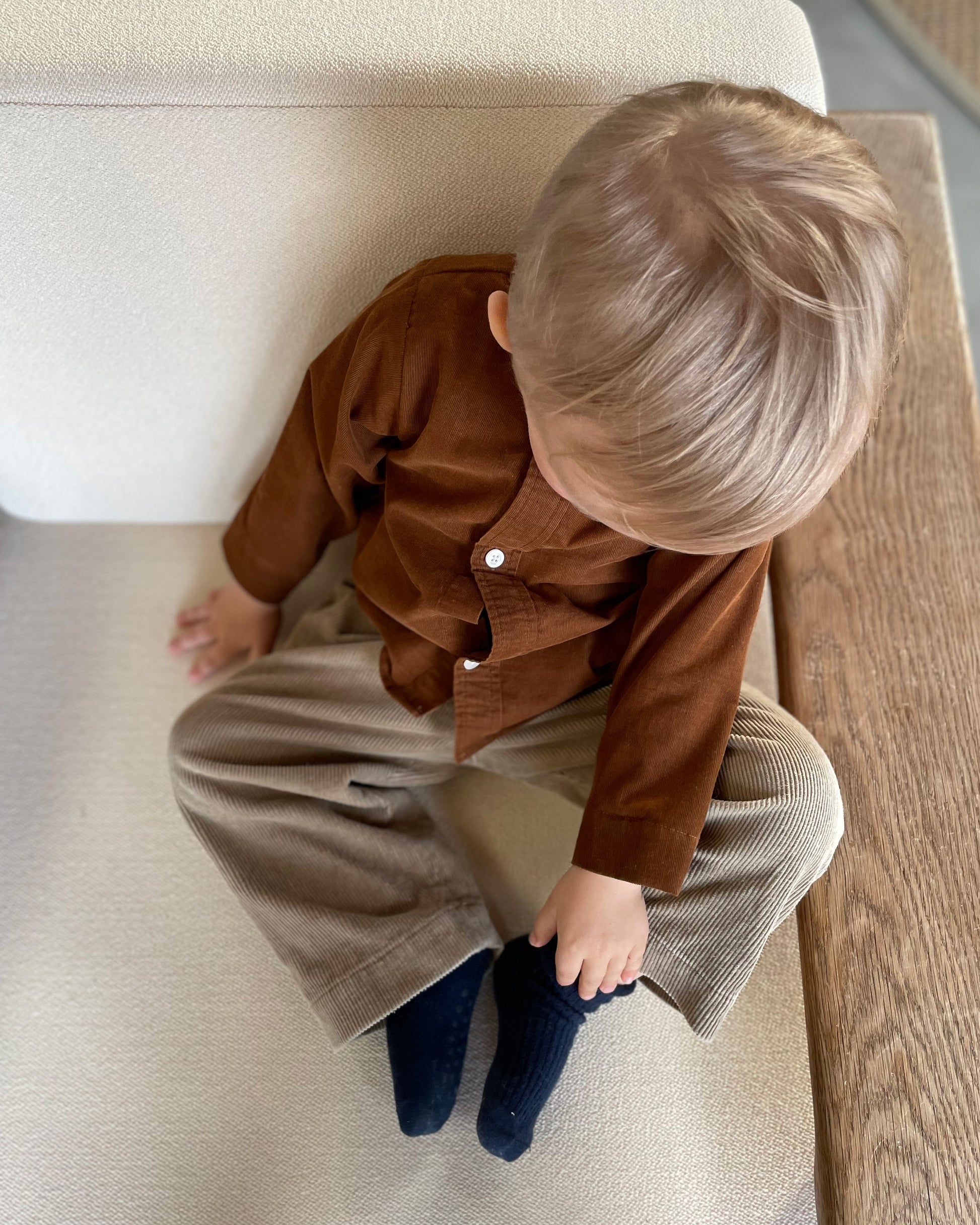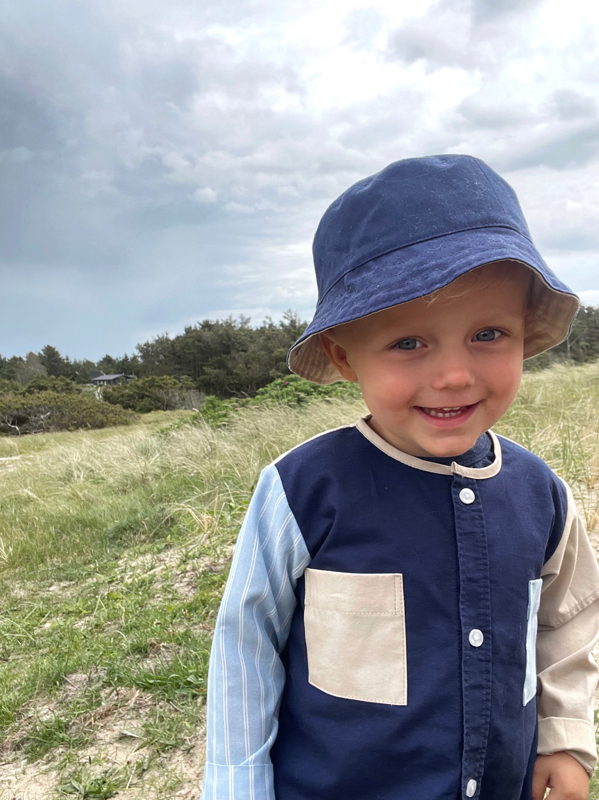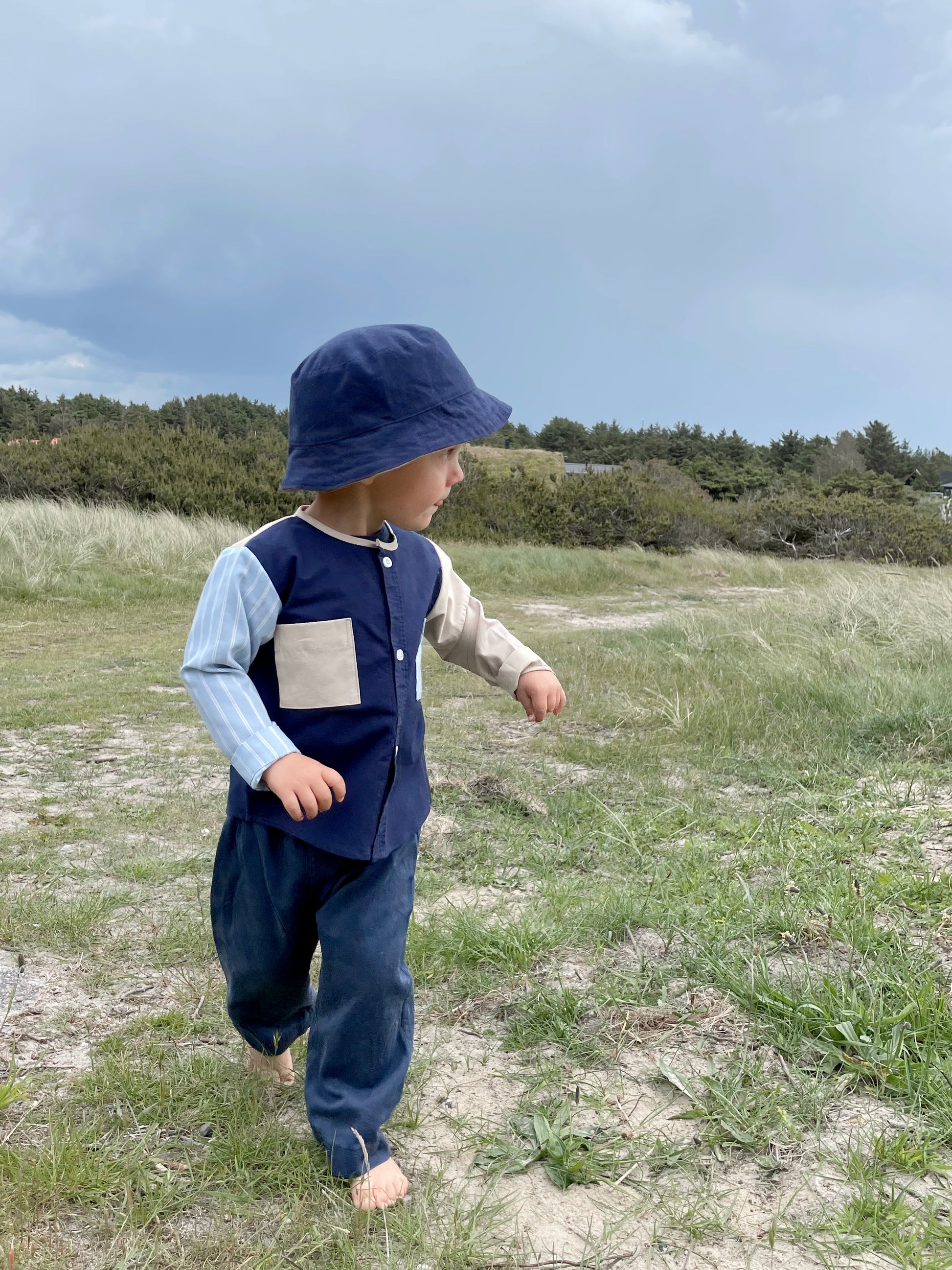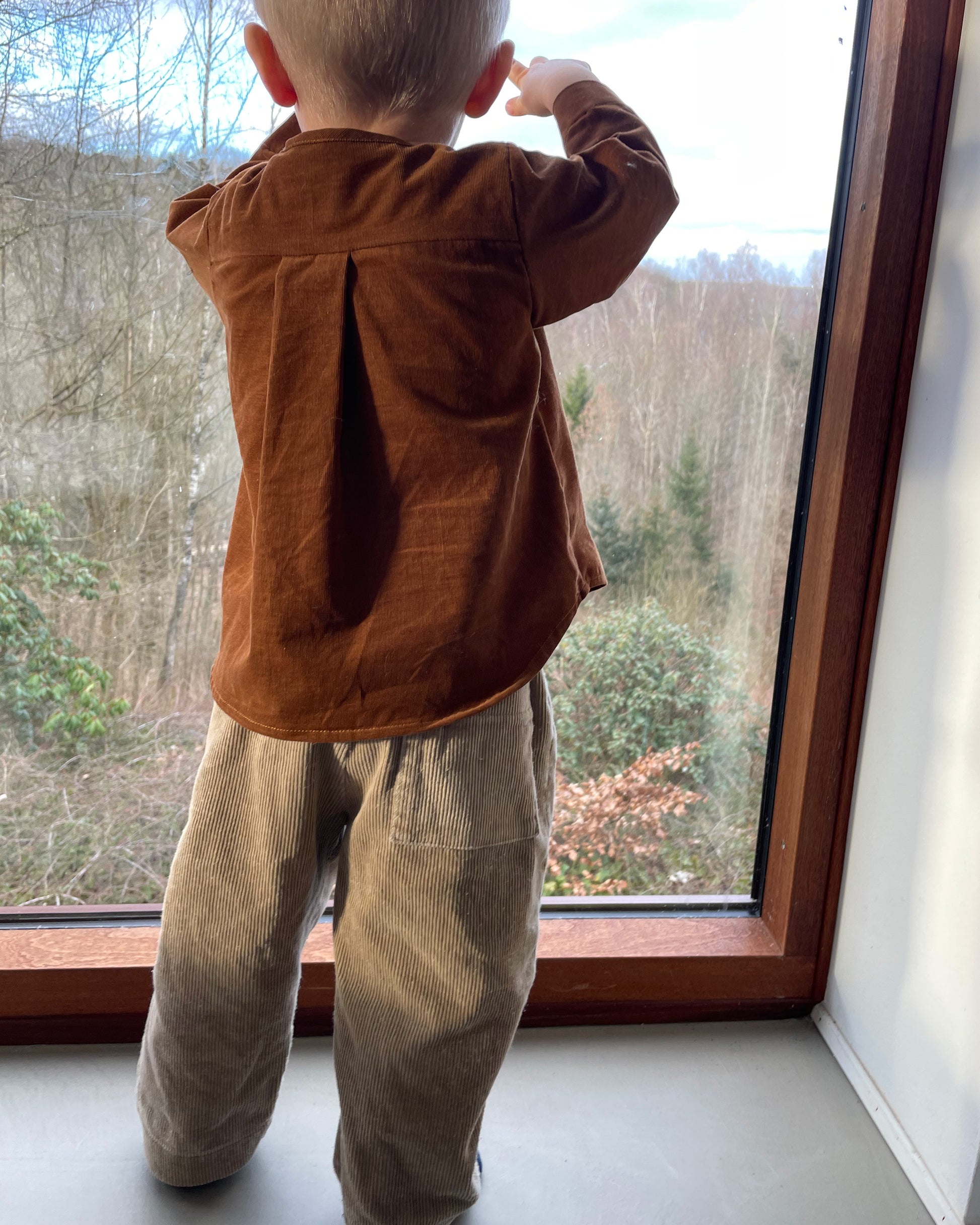 Walter Shirt Mini er en enkel børneskjorte, designet til at blive syet af f.eks en herreskjorte fra genbrug, men kan også syes af andet stof som f.eks bomuldslærred, babyfløjl, denim o.lign.